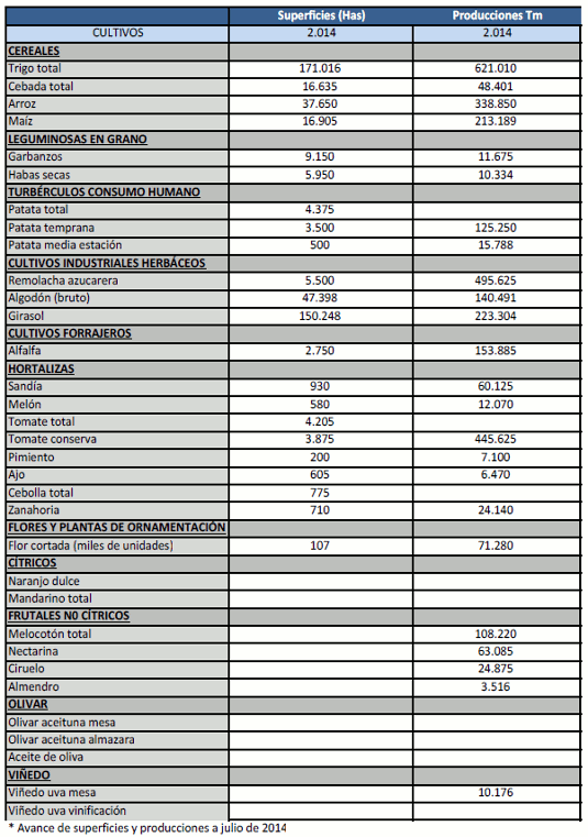 Avance de producciones y superficies agrícolas. Julio 2014