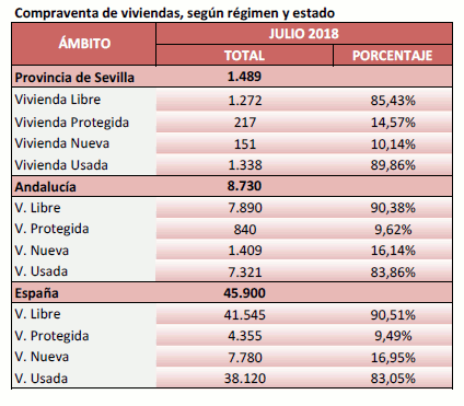 En Julio de 2018 se han registrado 1.489 contratos de compraventas de viviendas en la provincia de Sevilla. Un 15,9% más que el año anterior
