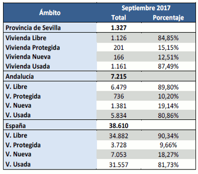 En Septiembre de 2017 se han registrado 1.327 contratos de compraventas de viviendas en la provincia de Sevilla. Un 26,6% más que el año anterior