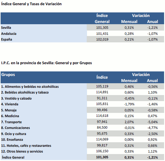 El IPC para la provincia de Sevilla aumenta en Febrero de 2015 un 0,31%, respecto al mes anterior, situando la tasa de variación interanual en un -1,21%