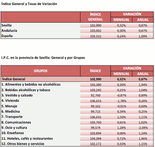 El IPC para la provincia de Sevilla crece un 0,32% en Febrero de 2019, en relación al mes anterior, situando la tasa de variación interanual en un 0,87%