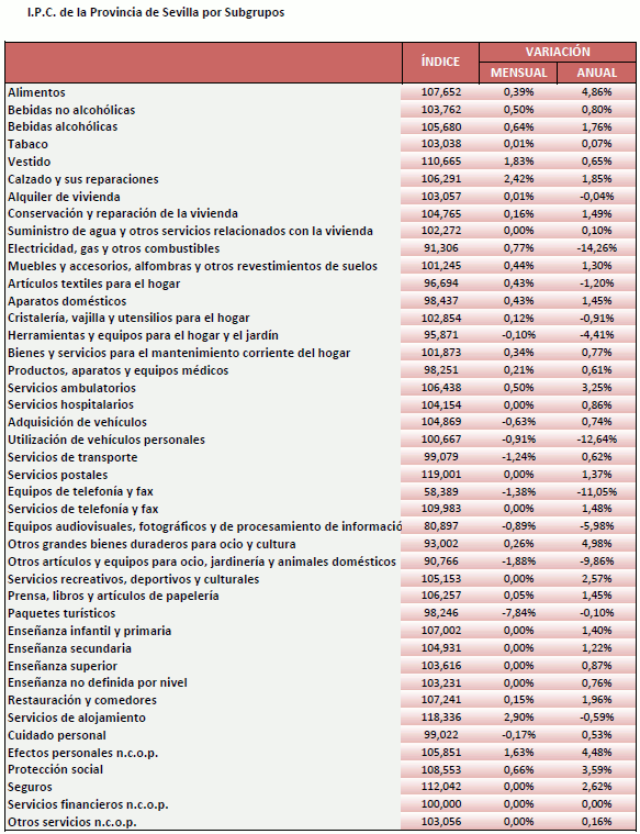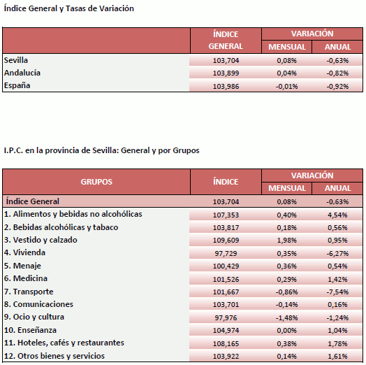El IPC para la provincia de Sevilla aumenta un 0,08% en Mayo de 2020, en relación al mes anterior, situando la tasa de variación interanual en el -0,63%