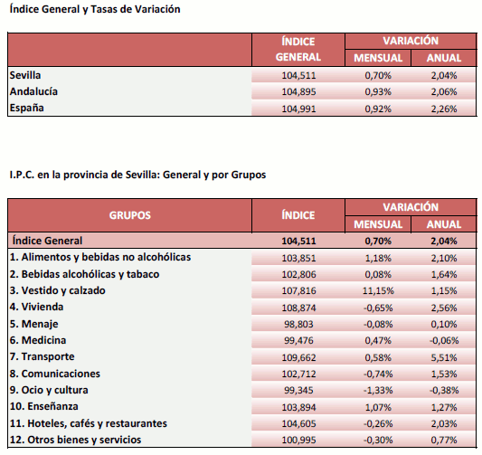 El IPC para la provincia de Sevilla aumenta un 0,70% en Octubre de 2018, en relación al mes anterior, situando la tasa de variación interanual en el 2,04%