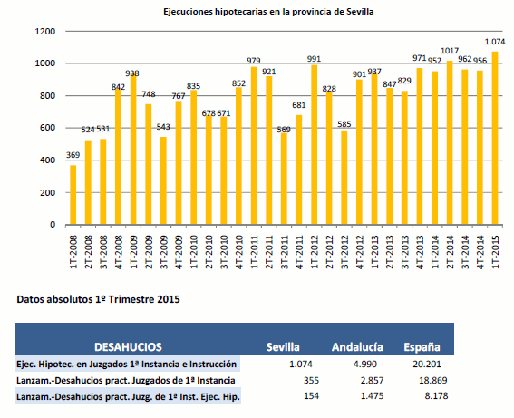 En el primer trimestre de 2015 los lanzamientos practicados sobre bienes inmuebles, desahucios, descendieron respecto al trimestre anterior un 2,5% en la Provincia de Sevilla
