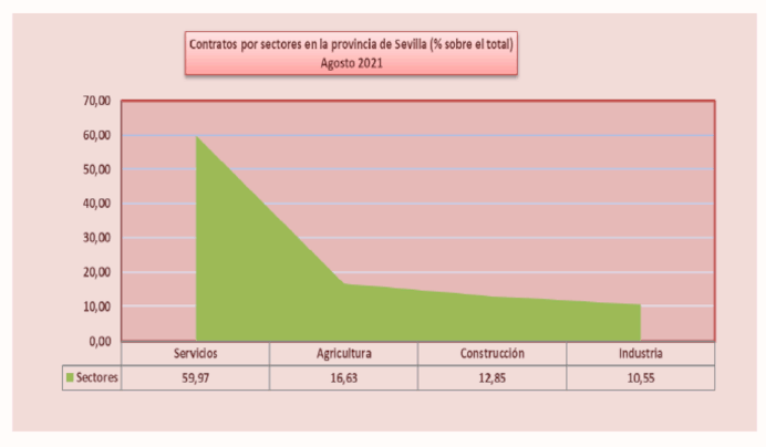 En Agosto de 2021, el paro registrado en el sector agrícola en la provincia de Sevilla alcanza un total de 14.084 personas, decreciendo el 16,26% respecto al mismo mes del añoanterior. El total de contratos en el sector agrícola en la provincia de Sevilla ha sido de 10.529 contratos que suponen el 16,63% del total de contratos provinciales