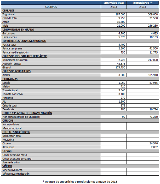 Avance de producciones y superficies agrícolas. Mayo 2013