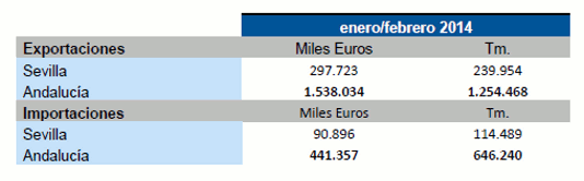 El valor de las exportaciones de productos agroalimentarios desde la provincia de Sevilla, creció el 34,3% en los dos primeros meses del año 2014, respecto al mismo periodo del año anterior, exportando un total de 239.954 Tm, por valor de 297.723 mil euros. Destacar que Sevilla es la segunda provincia andaluza con mayores ingresos por exportaciones, después de Almería.