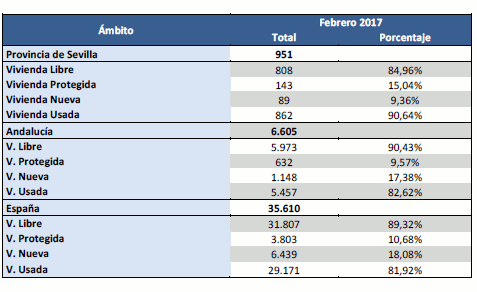 En Febrero de 2017 se han registrado 951 contratos de compraventas de viviendas en la provincia de Sevilla