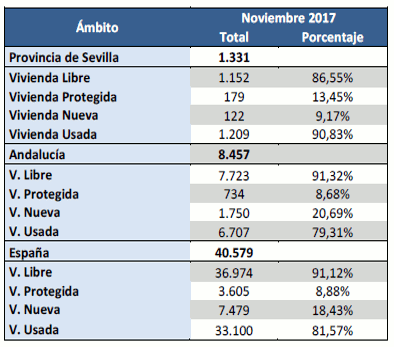 En Noviembre de 2017 se han registrado 1.331 contratos de compraventas de viviendas en la provincia de Sevilla. Un 31,3% más que el año anterior, y un 16,9% más que el mes anterior