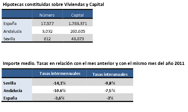 El importe medio de las hipotecas sobre viviendas en la provincia de Sevilla en Diciembre de 2012 baja un -14,1% en términos intermensuales