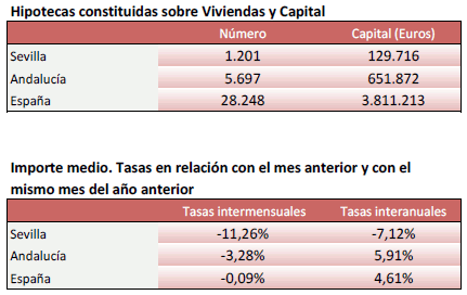 En Octubre de 2020, el número de hipotecas sobre viviendas en la provincia de Sevilla es de 1.201, un 9,2% más que el mismo mes del año anterior, y un 1,9% menos que el mes anterior