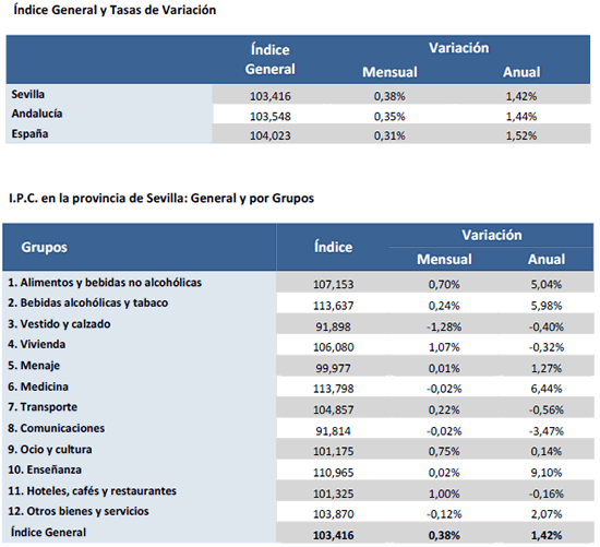 En Agosto vuelve a descender la inflación, situándose la tasa de variación interanual del IPC general en la provincia de Sevilla en un 1,42%, una décima inferior a la del mes anterior