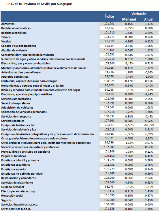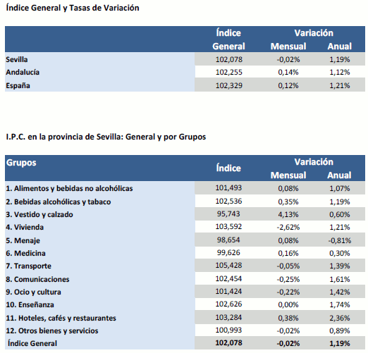 El IPC para la provincia de Sevilla registra una tasa de variación interanual del 1,19% en Marzo de 2018