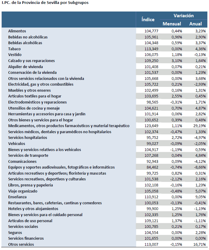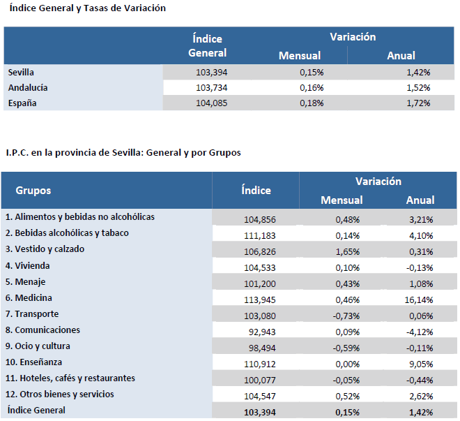 En Mayo el IPC de la provincia de Sevilla aumenta un 0,15%, respecto al mes anterior, y la tasa interanual asciende tres décimas, situándose en el 1,42%.