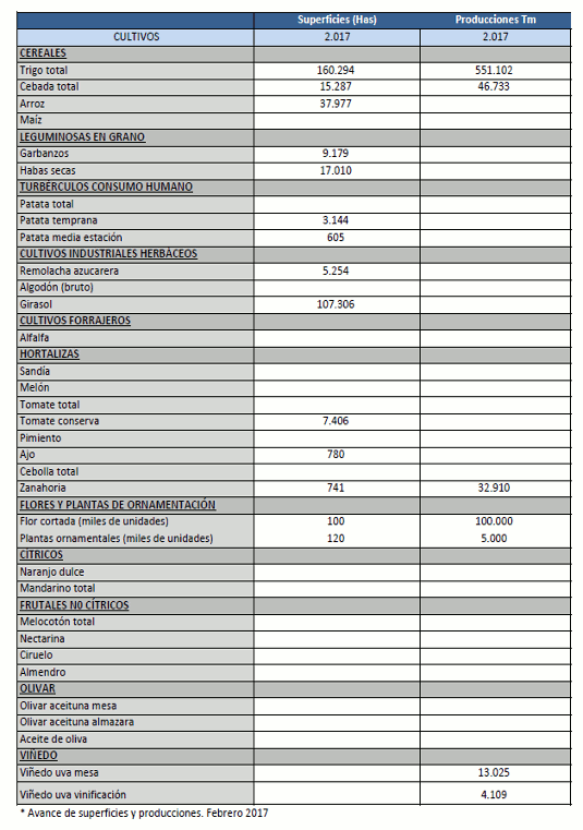 Avance de producciones y superficies agrícolas. Febrero 2017