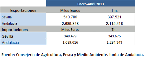 El valor alcanzado en las importaciones agroalimentarias desde Sevilla en el periodo enero‐abril 2013, ha sido de 349.479 mil euros, colocándose en primer lugar en valor económico en el reparto provincial andaluz. Este valor se pagó por un volumen total de importaciones para Sevilla de 343.675 Tm.