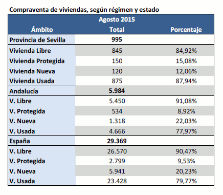 En Agosto de 2015 se han registrado 995 contratos de compraventas de viviendas en la provincia de Sevilla, un 27,6% más que el mismo mes del año anterior