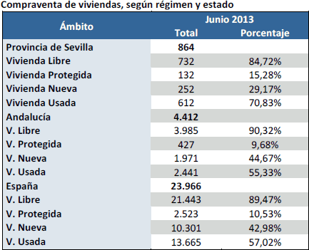 En Junio de 2013 se han registrado 864 contratos de compraventa de viviendas en la provincia de Sevilla.