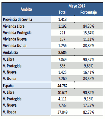 EnMayo de 2017 se han registrado 1.413 contratos de compraventas de viviendas en la provincia de Sevilla, un 24,6% más que el mismo mes del año anterior y un 38,9% más que el mes pasado