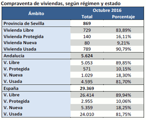 En Octubre de 2016 se han registrado 869 contratos de compraventas de viviendas en la provincia de Sevilla, un 9,9% más que el mismo mes del año anterior