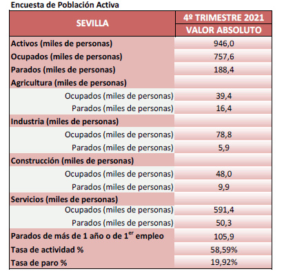En el cuarto trimestre de 2021 crece la ocupación en la provincia de Sevilla en un 5,38% con respecto al mismo trimestre del año anterior, mientras que el paro desciende en un -9,42% en términos interanuales