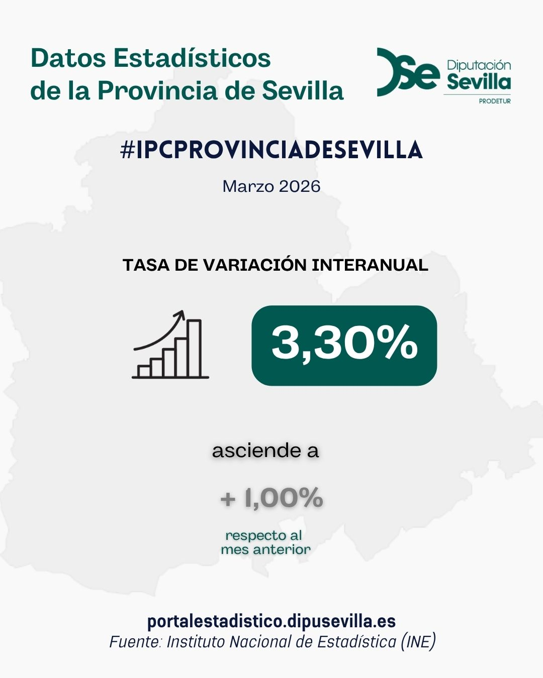 En marzo de 2026, el IPC para la provincia de Sevilla crece en un 1,00% con respecto al mes anterior, situándose la tasa de variación interanual en el 3,30%