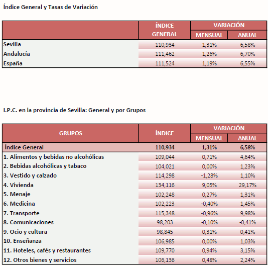 El IPC para la provincia de Sevilla crece un 6,58% en Diciembre de 2021, respecto al mismo mes del año anterior, alcanzando de nuevo su valor más alto en las últimas dos décadas
