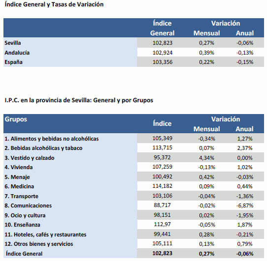 La tasa de variación interanual del IPC para la provincia de Sevilla se sitúa en Marzo de 2014, y por segundo mes consecutivo, en un -0,06%