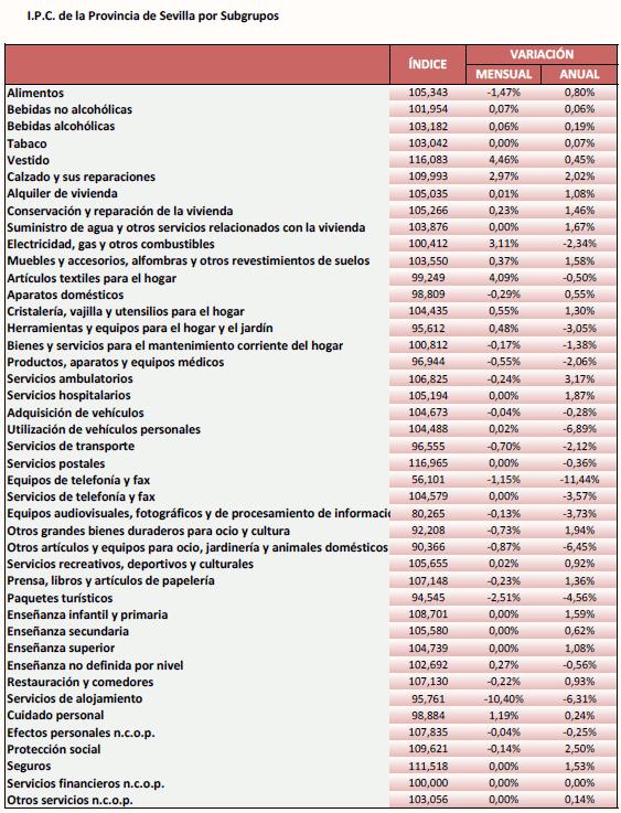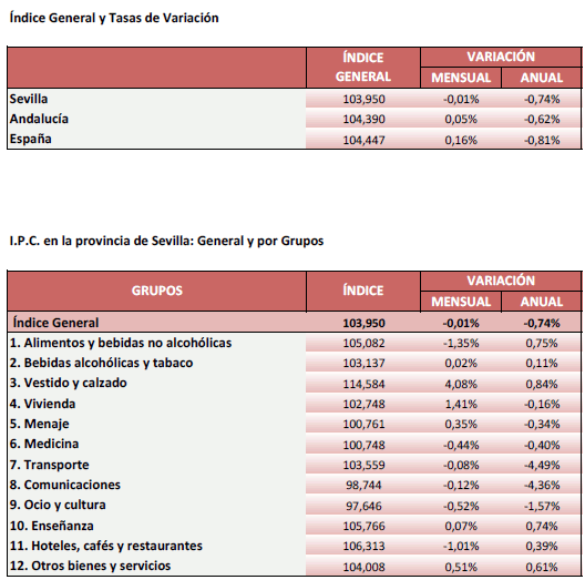 En Noviembre de 2020, el IPC para la provincia de Sevilla se mantiene estable en relación al mes anterior, situando la tasa de variación interanual en el -0,74%