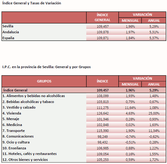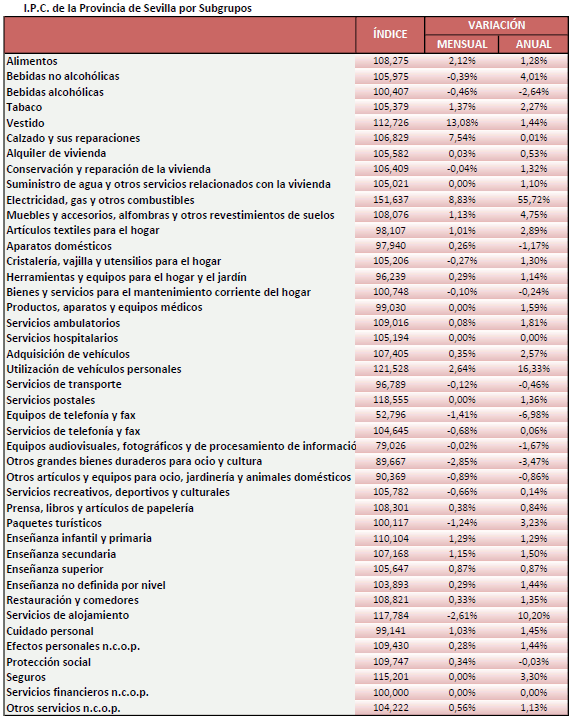 El IPC para la provincia de Sevilla crece un 1,96% en Octubre de 2021, respecto al mes anterior, situando la tasa de variación interanual en el 5,29%, su valor más alto en las últimas dos décadas