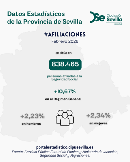 En febrero de 2026, el dato de afiliaciones a la Seguridad Social (último día del mes) se ha situado en 838.465, con lo cual ha aumentado en un 2,28% con respecto a febrero del año anterior. Se produce un incremento interanual de las afiliaciones de hombres (2,23%) y de mujeres (2,34%), así como en el Régimen General (10,67%)