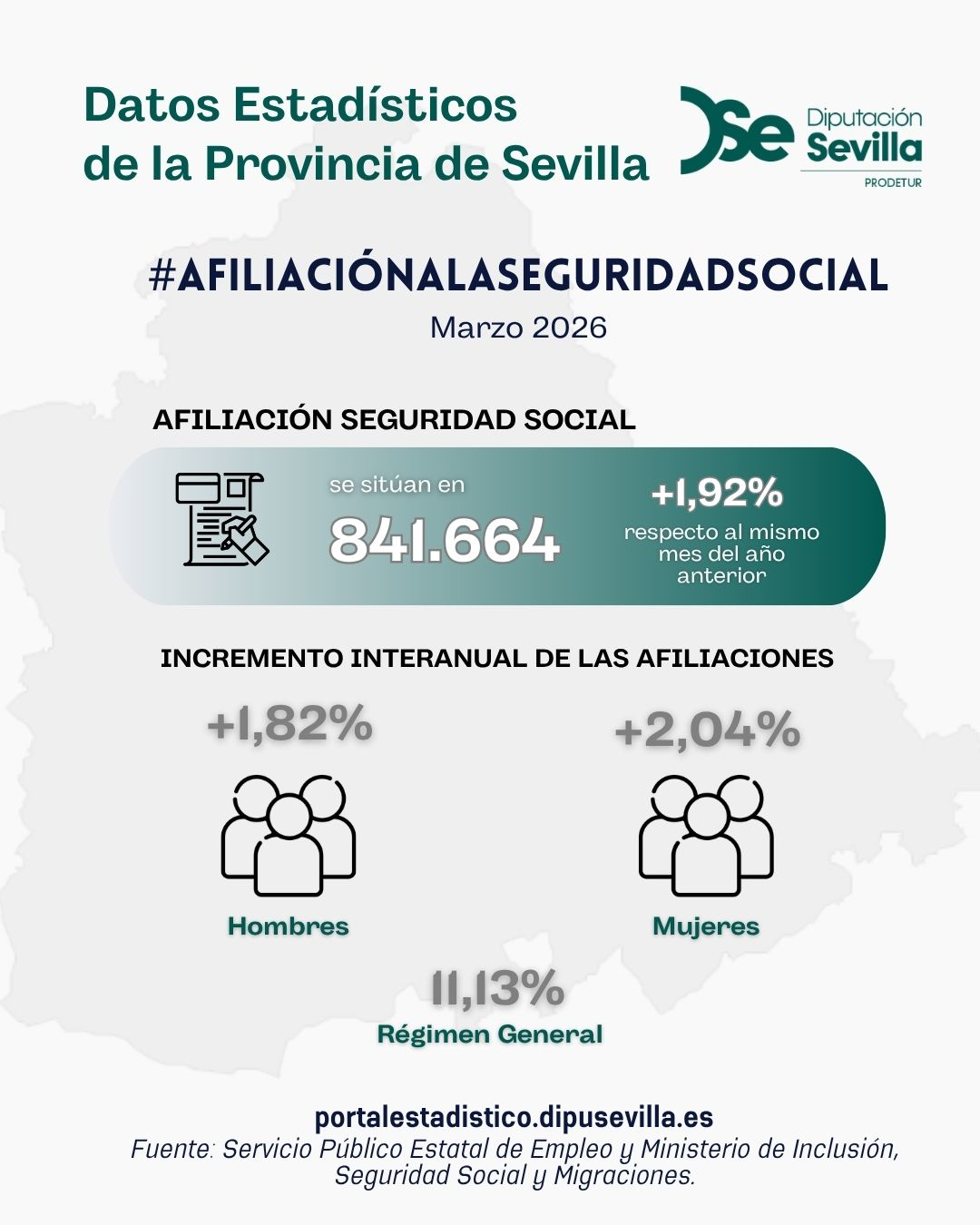 En marzo de 2026, el dato de afiliaciones a la Seguridad Social (último día del mes) se ha situado en 841.664, con lo cual ha aumentado en un 1,92% con respecto a marzo del año anterior. Se produce un incremento interanual de las afiliaciones de hombres (1,82%) y de mujeres (2,04%), así como en el Régimen General (11,13%)
