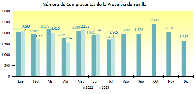 En Julio de 2023 se han registrado en la provincia de Sevilla 1.805 contratos de compraventa de viviendas, un 5,9% más que el mismo mes del año anterior, y un -7,3% menos que el mes anterior