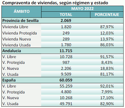 En Mayo de 2022 se han registrado en la provincia de Sevilla 2.069 contratos de compraventa de viviendas. Un 5,9% más que el mismo mes del año anterior, y un 12,7% más que el mes anterior