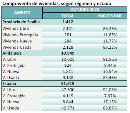 En Octubre de 2022 se han registrado en la provincia de Sevilla 2.412 contratos de compraventa de viviendas, un 25,3% más que el mismo mes del año anterior, y un 21,9% más que el mes anterior