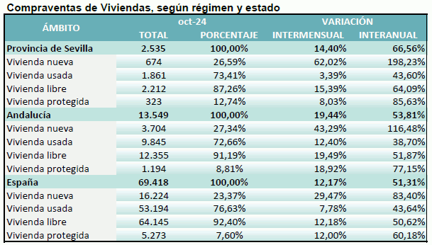 En octubre de 2024 se han registrado en la provincia de Sevilla 2.535 contratos de compraventa de viviendas, un 66,6% más que hace un año, y un 14,4% más que el mes anterior