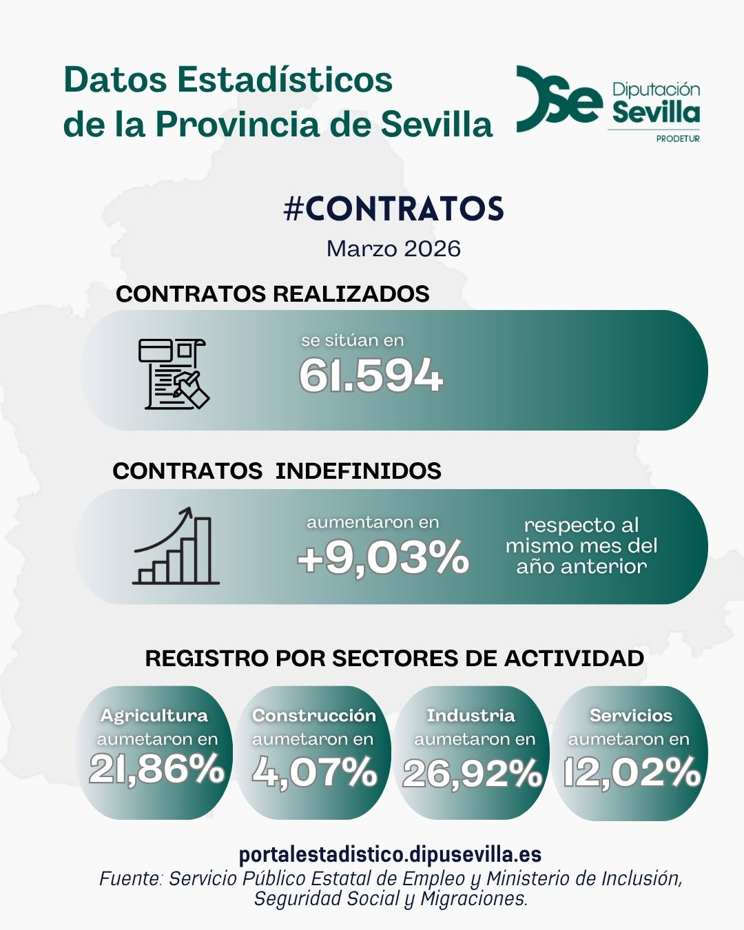 En marzo de 2026, el número de contratos realizados se sitúa en 61.594. Los contratos indefinidos crecen en 9,03% con respecto a marzo de 2025. Se registran incrementos en términos interanuales en todos los sectores de actividad: agricultura (21,86%), construcción (4,07%), industria (26,92%) y servicios (12,02%)