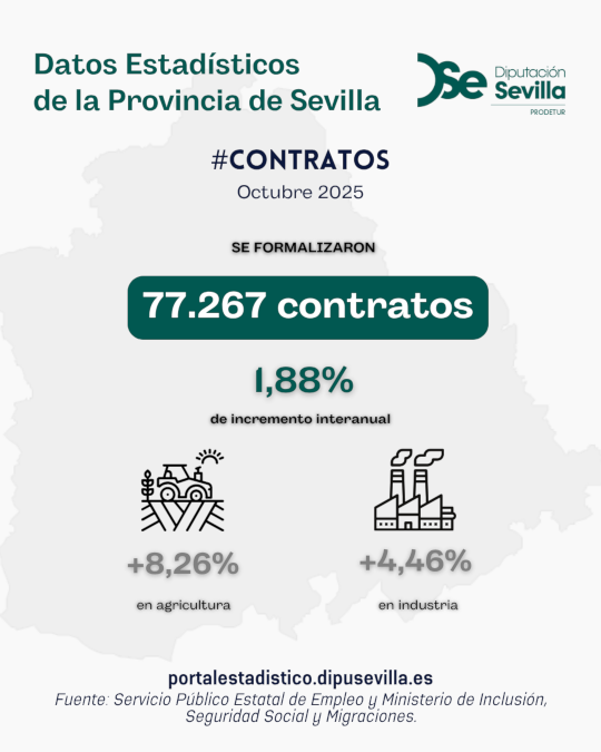 En octubre de 2025, el número de contratos ha aumentado en un 1,88% con respecto a octubre del año anterior. El dato se sitúa en 77.267 contratos realizados. Se registran incrementos en términos interanuales en los sectores de agricultura, con un 8,26% y en el sector industrial, con un 4,46%