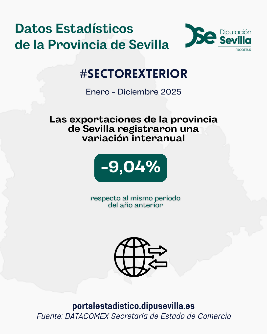 El valor de las exportaciones de la provincia de Sevilla para el período enero-diciembre de 2025 ha alcanzado una cifra de 9.074.742,67 miles de euros, un 9,04% menos que el año anterior.