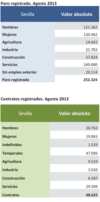 El número de parados registrados en la provincia de Sevilla en el mes de Agosto de 2013 se ha situado en 252.324 personas, 130.962 mujeres y 121.362 hombres