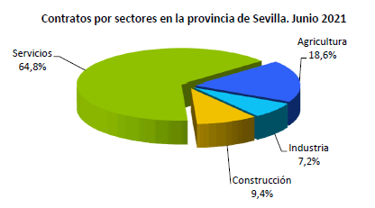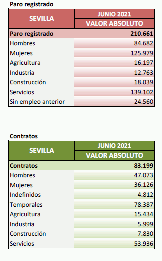 En Junio de 2021, el paro registrado ha descendido en un -7,79% con respecto al mismo mes del año anterior. Los contratos aumentan en un 34,94% en términos interanuales
