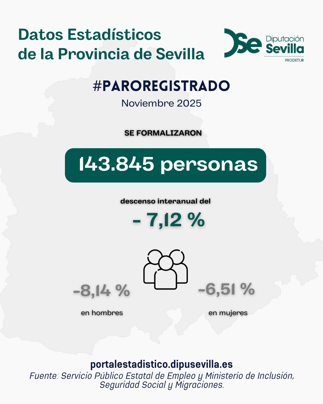 En noviembre de 2025, el paro registrado ha descendido en un -7,12% con respecto a noviembre del año anterior. El dato se sitúa en 143.845 personas inscritas. Se registran descensos en términos interanuales en hombres, con un -8,14% y en mujeres, con un -6,51%