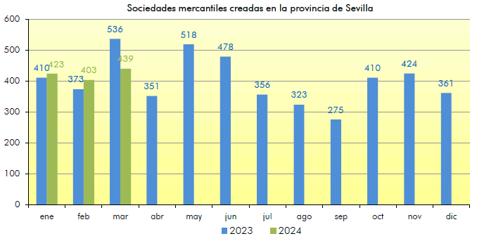 En Marzo de 2024 se han creado en la provincia de Sevilla 439 sociedades mercantiles, un 18,1% menos que en el mismo mes del año anterior, y crece un 8,9% respecto al mes anterior