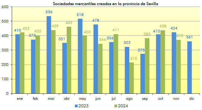 En noviembre de 2024 se han creado en la provincia de Sevilla 372 sociedades mercantiles, un 12,3% menos que en el mismo mes del año anterior, y un 15,1% menos respecto al mes anterior