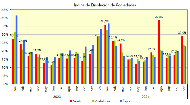 • El índice de disolución empresarial en noviembre de se sitúa en un 29% para la provincia de Sevilla. Para Andalucía se sitúa en un 23,7%, y para España en un 22,9%.