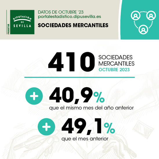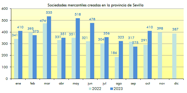 En Octubre de 2023 se han creado en la provincia de Sevilla 410 sociedades mercantiles, un 40,9% más que en el mismo mes del año anterior, y un 49,1% más que el mes anterior