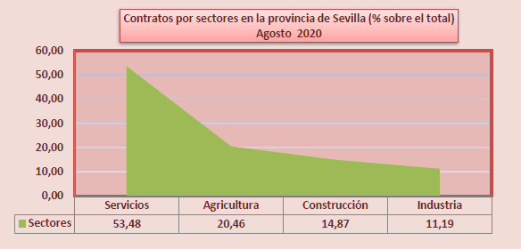 En Agosto de 2020, el paro registrado en el sector agrícola en la provincia de Sevilla alcanza un total de 16.818 personas, creciendo el 36,39% respecto al mismo mes del añoanterior. El total de contratos en el sector agrícola en la provincia de Sevilla ha sido de 11.257 contratos que suponen el 20,46% del total de contratos provinciales