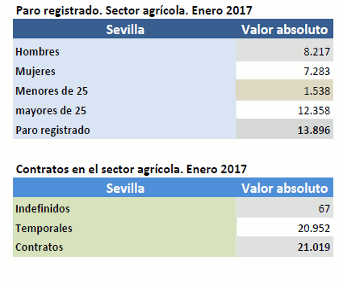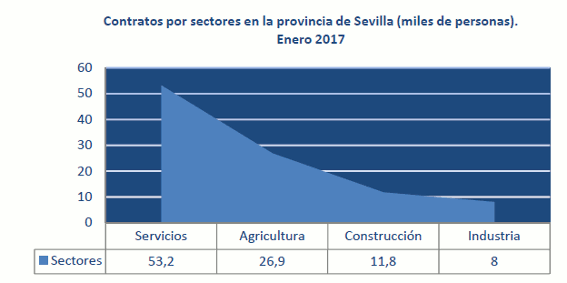 En Enero de 2017, el paro registrado en el sector agrícola en la provincia de Sevilla ha descendido un 9,65% respecto al mismo mes del año anterior. Los contratos en el sector agrícola en la provincia de Sevilla suponen el 26,9% del total de contratos provinciales y crecen en un 32,75% en términos interanuales