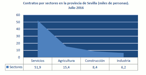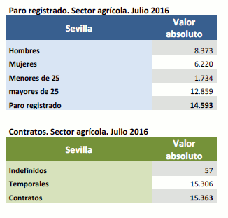 En Julio de 2016, el paro registrado en el sector agrícola en la provincia de Sevilla ha descendido un 3,42% respecto al mismo mes del año anterior. Los contratos suponen el 18,8% del total de contratos provinciales y crecen un 16,2% respecto al mismo periodo del año 2015