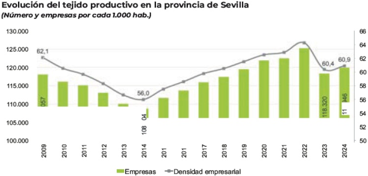 Según los datos del Directorio Central de Empresas (DIRCE), en 2024 operaban en la provincia de Sevilla un total de 119.946 empresas activas.